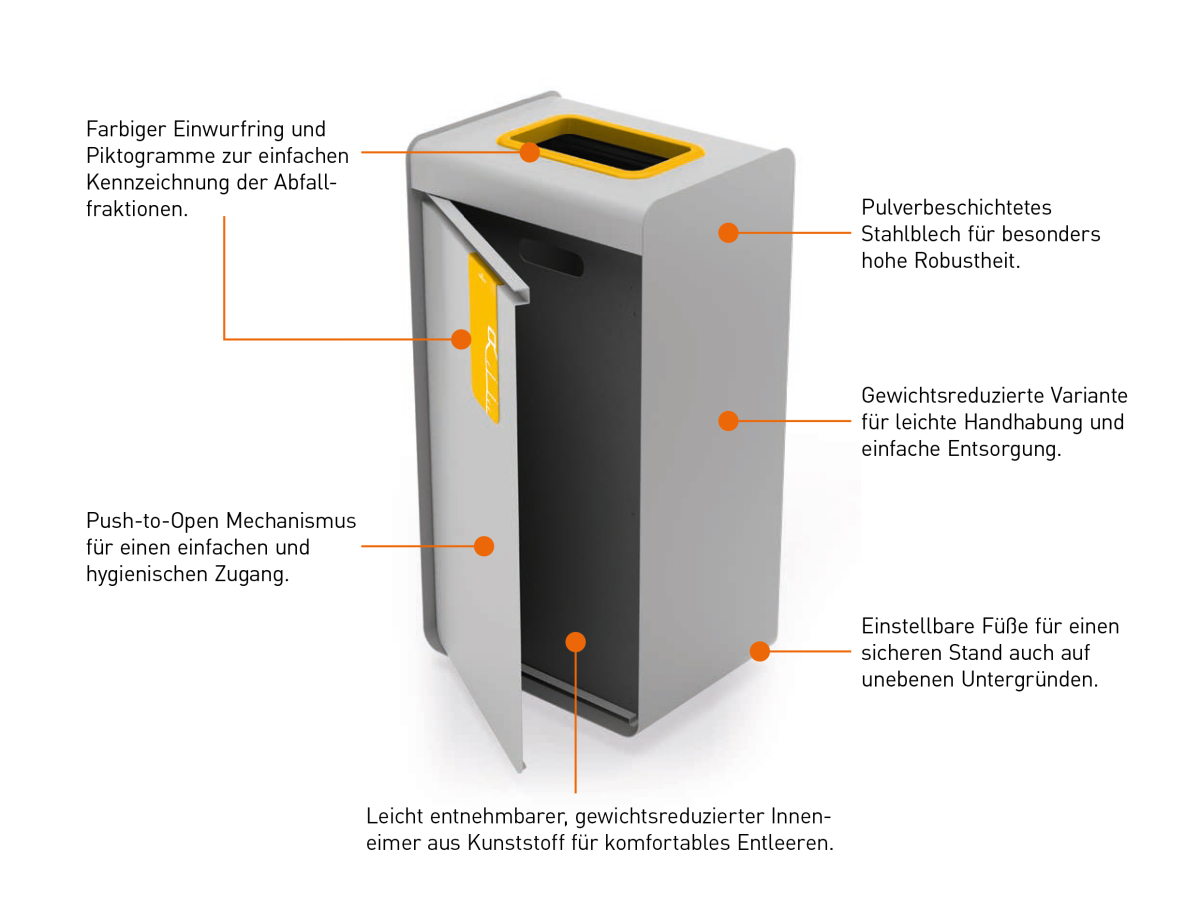 Der DURASORT® Wertstoffsammler hilft dabei, die Umwelt zu schonen und die Recyclingquote zu steigern, indem er die Trennung von Abfallarten wie Restmüll, Papier, Kunststoff, Bioabfall und Glas einfach und intuitiv macht.