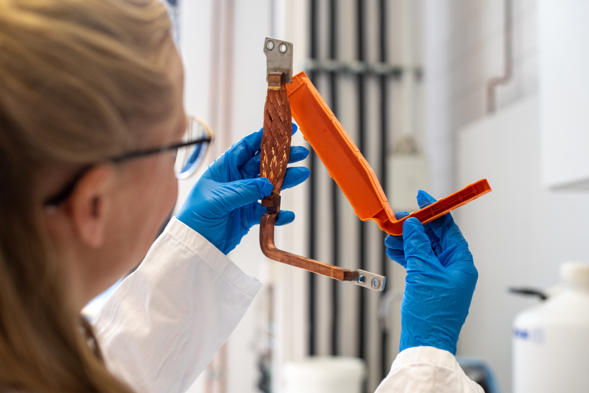 Verklebt oder verschraubt: Merle Zorn untersucht eine Stromleitschiene – ein Bauteil einer Elektrofahrzeugbatterie – aus Kupfer und einem Kunststoffgehäuse. Verschraubte Bauteile sind wesentlich recyclingfreundlicher