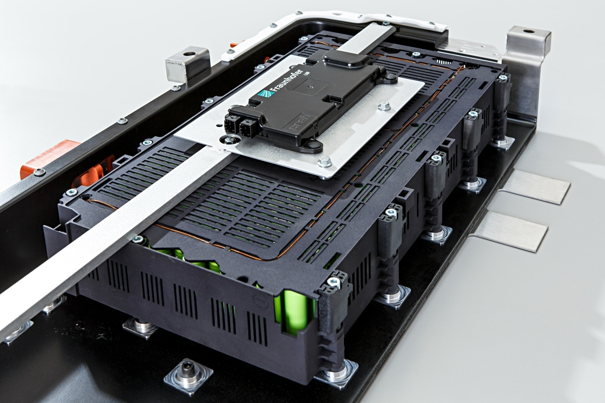 Aufbau der leichten, recyclingfähigen Batterie in Modulbauweise mit Crash-Streben, Batteriemanagementsystem und den elektrischen Anschlüssen