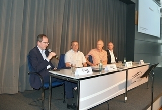 Christian Eckert vom ZVEI e. V., Moderator Andreas Habel, Olaf Dechow, langjähriger Abfallbeauftragter der Otto Group und André Rückert von der Ecologicon GmbH auf dem Podium (v.l.n.r.)