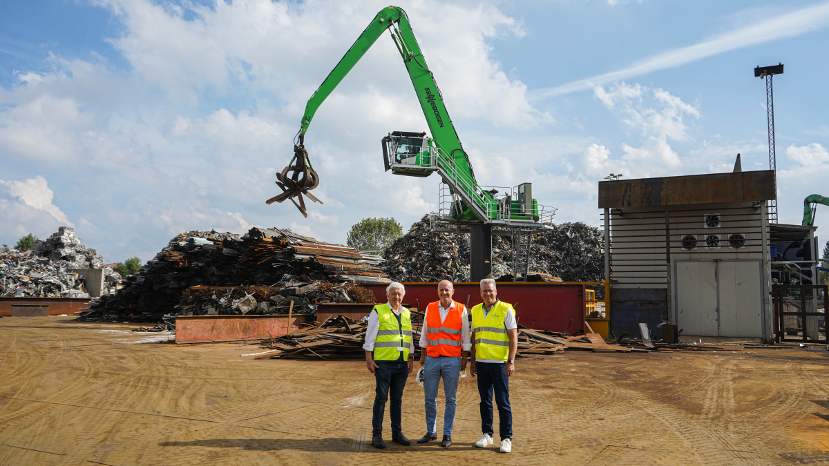 Sennebogen salesman Paolo Boscoscuro from Cesaro Mac Import, Padana Rottami managing director Simone Graziotto and marketing manager Michael Ibarth from Sennebogen (f.l.)