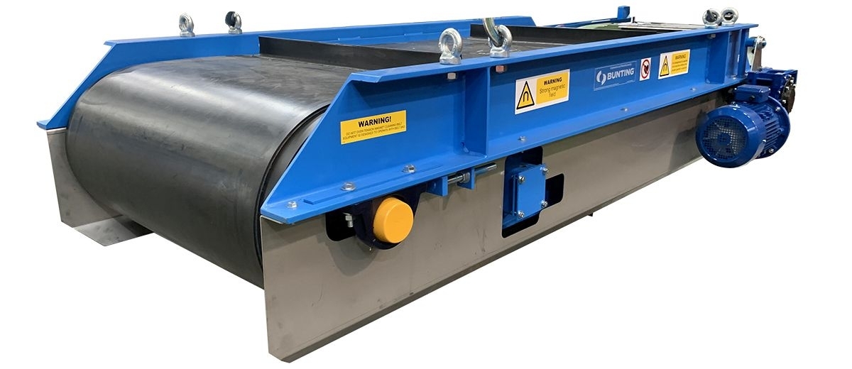 Overband Magnets have a permanent or electromagnetic block mounted between two pulleys over which continuously runs a cleaning belt. In operation, the Overband Magnet is suspended over a conveyor transporting material such as waste, both industrial and household, and quarried rock. The magnetic field of the centrally located magnet block attracts ferrous metals and other magnetic materials up and out of the conveyed material. Between the magnet box face and the separated metal is a moving cleaning belt with upstands, which transfers the captured material away from the conveyor and out of the magnetic field into a separate collection area.